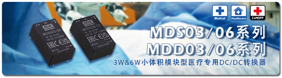 转换器制造商明纬模块电源推出了新款3W/6W单组输出MDS03/06和双组输出MDD03/06系列,这四个系列具有以下主要特点:小巧的1.25英寸x 0.8英寸尺寸、超宽的4:1输入范围、-40 ~ +90℃超宽温度范围、超低的5μA漏电流、符合IEC60601-1医疗法规的2×MOPP加强隔离和4KVac/6KVdc绝缘测试。这些转换器非常适用于需要提高系统绝缘和降低漏电流的医疗设备,如手术刀、医疗屏幕、溶氧监测器、医疗推车和口腔护理设备等,以提高整个系统的安全性,避免病人触电危险。