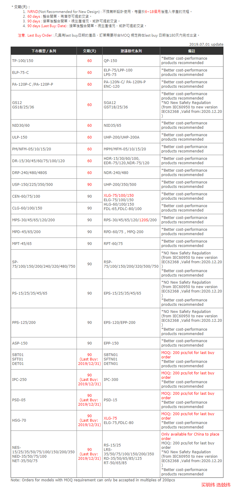 -“产品下市公告”与“停产公告”,让客户能随时掌握明纬新旧品替代规划。在未来,伴随着明纬价表于每年1月与7月的正式公告“产品下市公告”与 “停产公告”也将同步更新。若有任何疑问,请与您的业务窗口联系,谢谢!