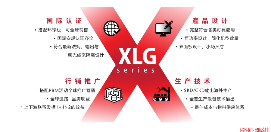 明纬除了持续秉持开发优化性价比的标准电源来服务客户外,更于今年结合供货商及Powered By MEAN WELL(PBM)客户来共同营销产品,期许透过彼此的优势,一起提升竞争力,并将彼此的产品共同推广到全世界。目前XLG全系列已结合Powered By MEAN WELL (PBM)联合营销活动进行全球推广。XLG系列不仅在功能上具有规格优势,更是结合明纬与客户间信赖合作关系的营销代表作,以创新营销模式,将产品以SKD/CKD模式出口到海外工厂生产。