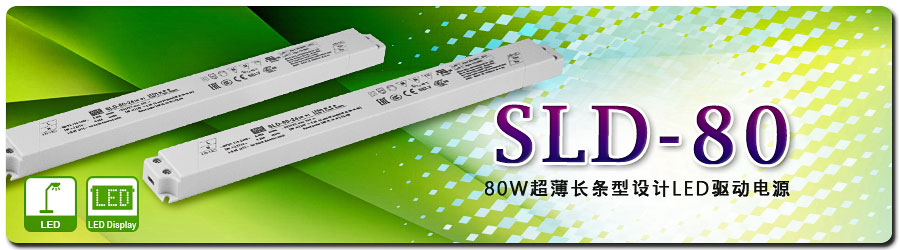 新系列SLD-80 (80W)除了有超薄长条外型设计优势外,规格上也能因应灯具的多样化,而有相对应的机型可供选择。12V/24V输出机型提供定电压及定电流两用设计,可搭配市面上任何定电压或定电流LED灯条与灯带。56V输出的机型,则采恒功率设计,可降低机型数量,并适用于任何LED输出驱动电压范围在30~56V之间,更能透过输出端预留的可变电阻,让使用者自行调整输出电流范围,涵盖700mA到2100 mA(全功率使用范围在1400~2100 m A)。SLD-80超薄型