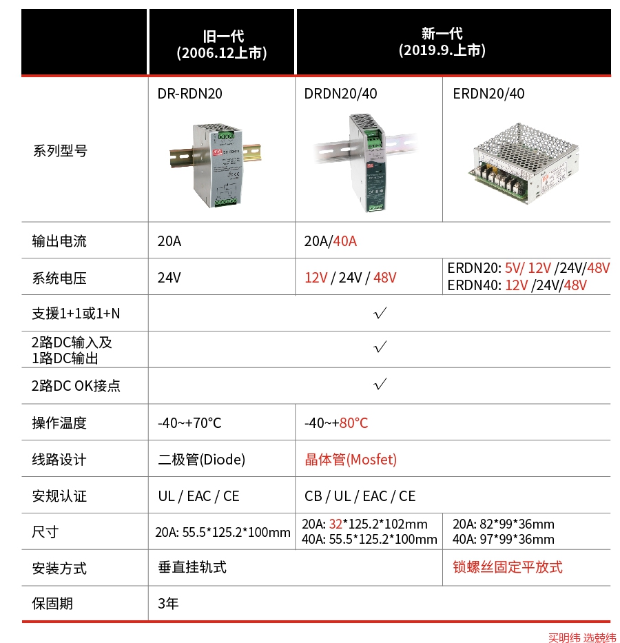 明纬轨道式DR-RDN20电源供应器冗余模块已销售13年之久,由于尺寸偏大、内部线路采二极管设计精准度性能需提升,因此明纬新开发了次世代轨道型可快速挂轨的DRDN20/40系列,并同时规划了采锁螺丝固定的机壳型ERDN20/40系列,新旧世代详细差异如下表。