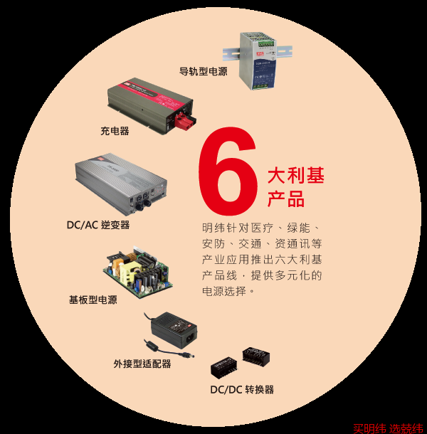 明纬是市面上种类最齐全的电源品牌,机壳型电源与LED驱动电源,是明纬的两大主流产品。此外针对医疗、绿能、安防、交通、资通讯等产业应用,明纬推出六大利基产品,提供多元化电源选择,同时推出了KNX产品抢攻智能楼宇自动化市场。