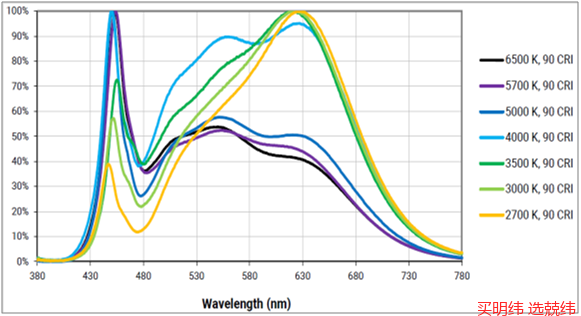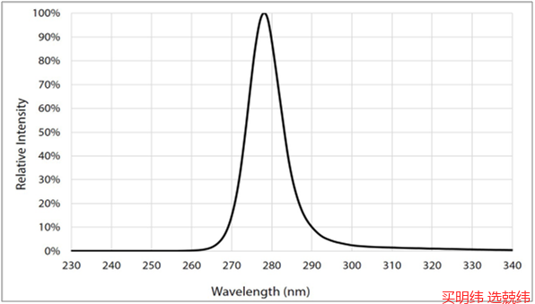 与常规照明所使用的LED发射的分散型波长光不同,UV-C LED则通常发射100%强度时波长为275nm的短波紫外线以起到杀菌作用。图1a与图1b分别为UV-C LED和照明LED的强度与波长关系图。为了保证有效的杀菌,UV-C LED设计着重于保证100%强度下波长为275nm