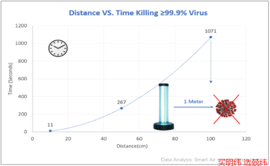如图2的距离与时间的关系曲线所示,当光源距离45厘米杀死99.9%的细菌需要5分钟,但距离100厘米时则需要18分钟。所以时间与距离是UV-C LED使用中的两个重要参量。UV-C LED设备也常常具有可以设置每定时开关循环杀菌的功能。常见的开关频率为每15或30分钟。