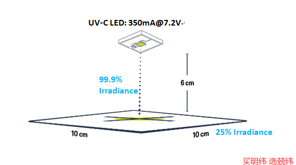 用于杀菌时需要注意两个方面: 距离与时间。如图3所示,单一一颗2.5瓦的UV-C LED可以杀死直径为10厘米的平面内百分之九十九的细菌。由于辐射照度等于单位面积内的辐射通量,且距离越远时,辐射通量越低。如果一个光源距离平面6 厘米时可杀死99.9%的细菌,将相同光源放远到10厘米时,则只能在相同时间内杀死25%的细菌。为达到相同杀菌效果,就需要更长的光照时间。