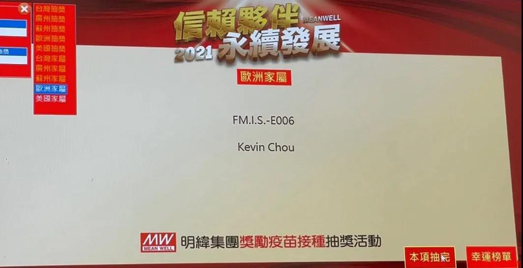 明纬为鼓励员工施打疫苗,总部已完成第三次奖励疫苗接种每月一次的抽奖活动,并扩大至明纬同仁的同住家人,预计第四次抽奖将于12/6举行。
