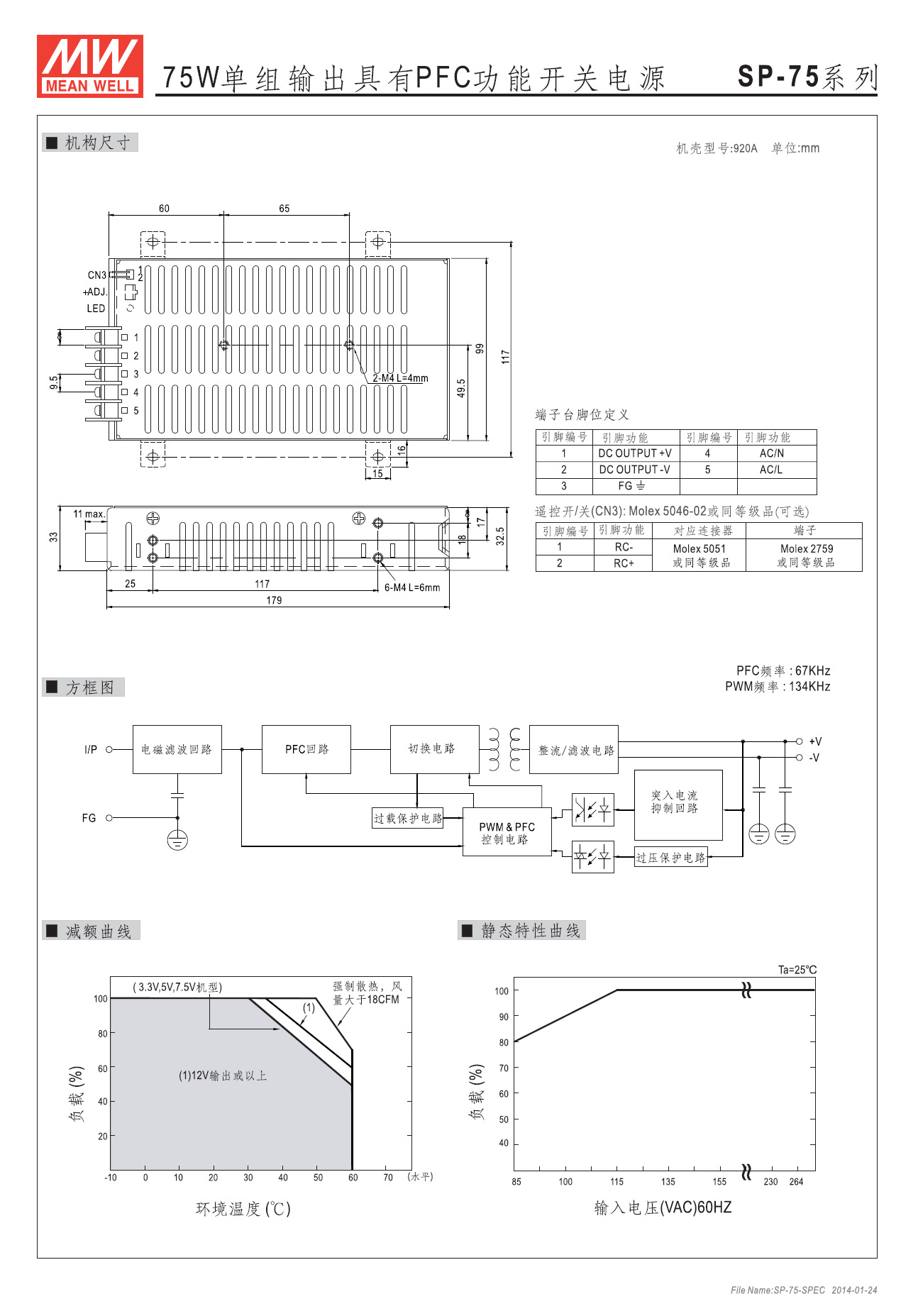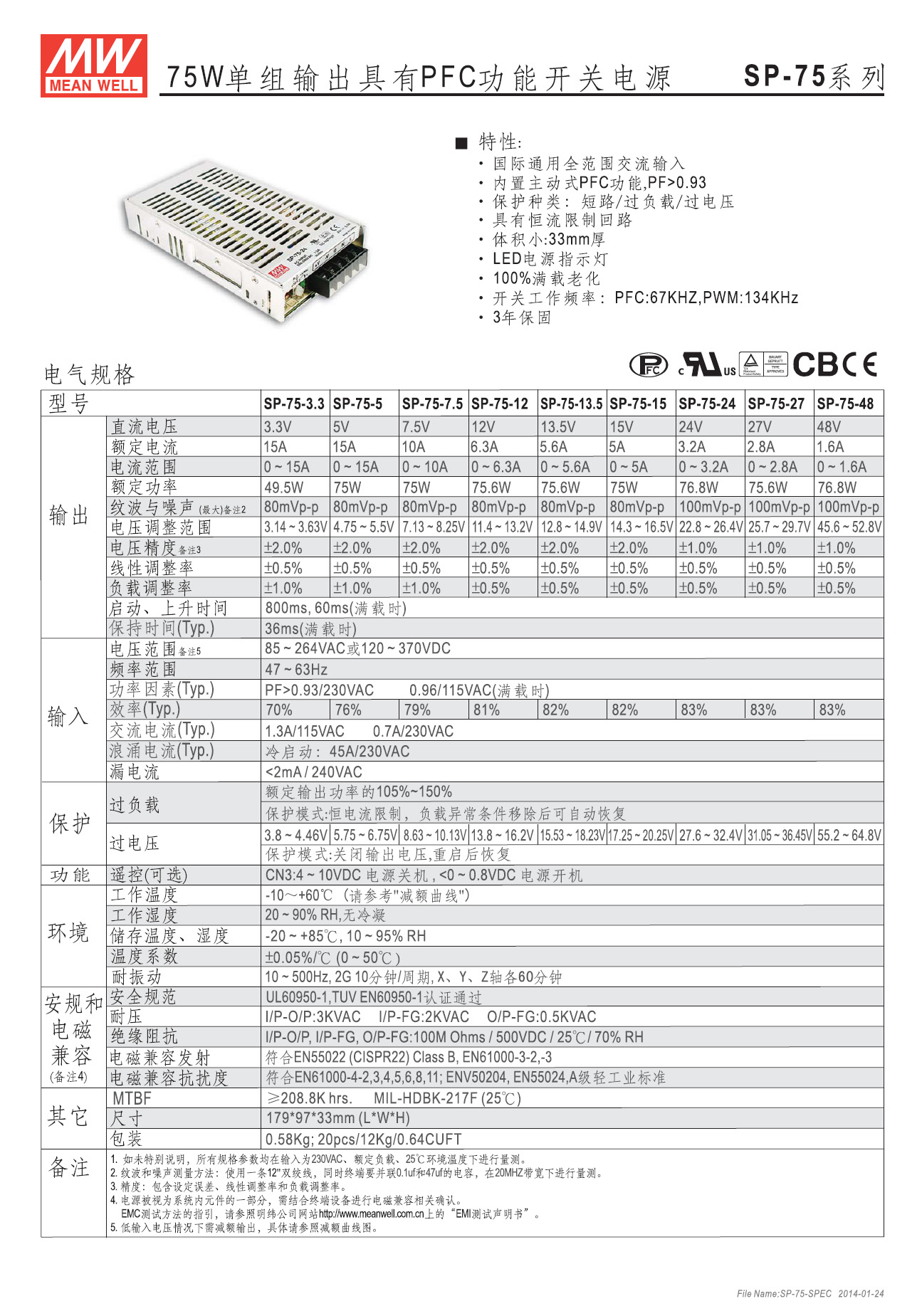 SP-75 系列■ 主要特点全球通用全范围交流输入电压内置主动式功率因素校正电路,功率因素:115VAC时PF>0.96;230VAC时PF>0.93薄型外观(33mm)有短路保护/过载保护/过电压保护国际安规认证:UL/TUV/CB/CE有恒流限流功能远端控制ON/OFF功能(选装)自然通风冷却PWM频率:134Hz,PFC频率:67HzLED指示工作状态高效、长寿命、高可靠100%满载老化测试采用无铅制程,符合环保RoHS要求台湾明纬品牌,苏州工厂生产3年质保Mean Well SP-75-3.3/5/7.5/12/13.5/15//24/27/48V 直流稳压 台湾明纬电源