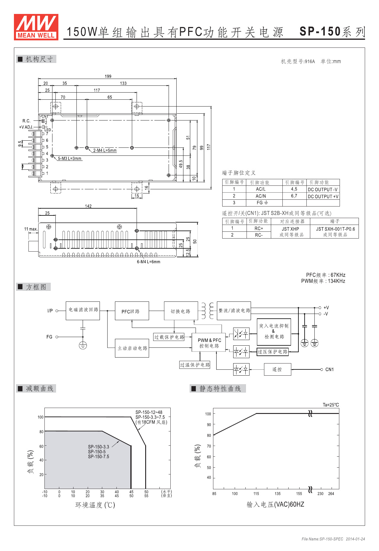 SP-150 系列■ 主要特点全球通用全范围交流输入电压内置主动式功率因素校正电路,功率因素:115VAC时PF>0.96;230VAC时PF>0.93有短路保护/过载保护/过电压保护/过热保护国际安规认证:UL/TUV/CB/CE有恒流限流功能远端控制ON/OFF功能(选装)自然通风冷却PWM频率:134Hz,PFC频率:67HzLED指示工作状态高效、长寿命、高可靠100%满载老化测试采用无铅制程,符合环保RoHS要求台湾明纬品牌,苏州工厂生产3年质保MeanWell SP-150-3.3/5/7.5/12/15/13.5/15/24/27/48 输出具有PFC功能开关电源