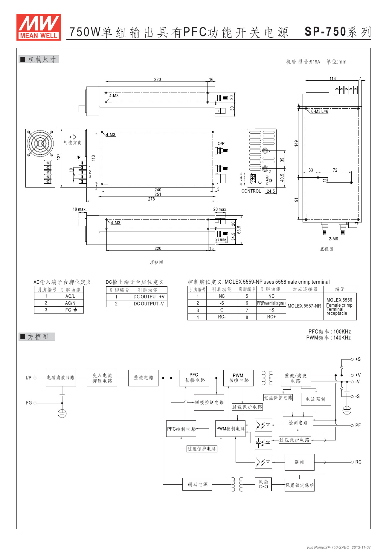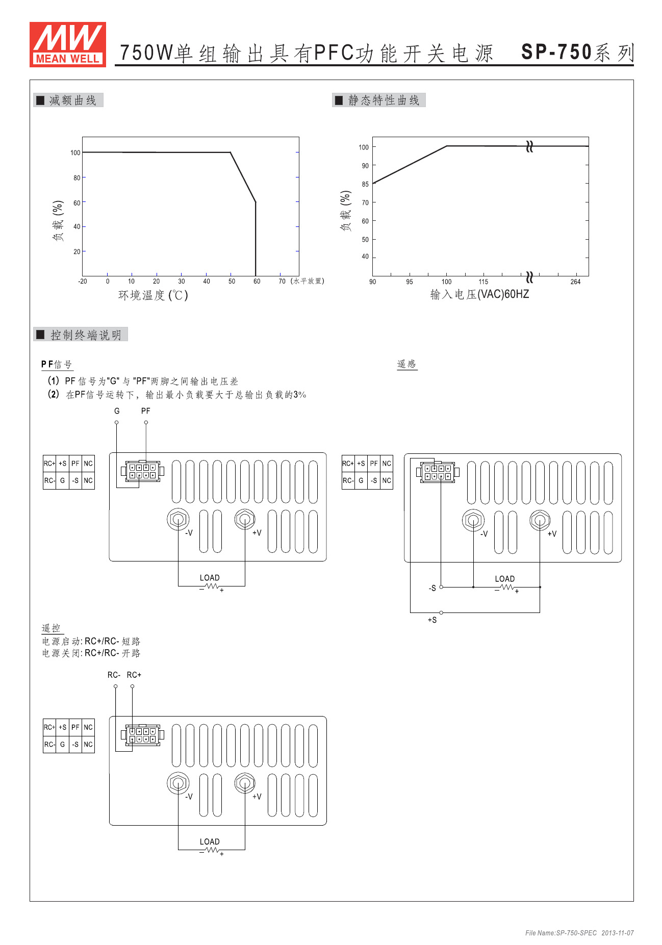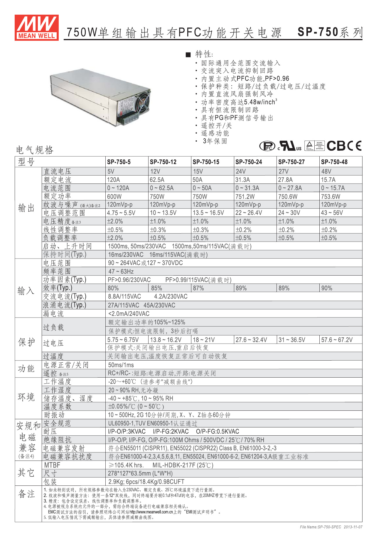 SP-750 系列■ 主要特点全球通用全范围交流输入电压内置主动式功率因素校正电路,功率因素>0.96有短路保护/过载保护/过电压保护/过热保护国际安规认证:UL/TUV/CB/CE高功率密度5.48W/in3有PG/PF信号(电源停机信号)输出内置远端检功能(具有线路损耗补偿功能)和远端开关机控制由内置转速控制直流风扇强制通风冷却PWM频率:140Hz,PFC频率:100HzLED指示工作状态高效、长寿命、高可靠100%满载老化测试采用无铅制程,符合环保RoHS要求台湾明纬品牌,台湾工厂生产3年质保Meanwell SP-750-5/12/15/24/27/48 750W台湾原装明纬开关电源SP-750-5 SP-750-12 SP-750-15 SP-750-24 SP-750-27 SP-750-48