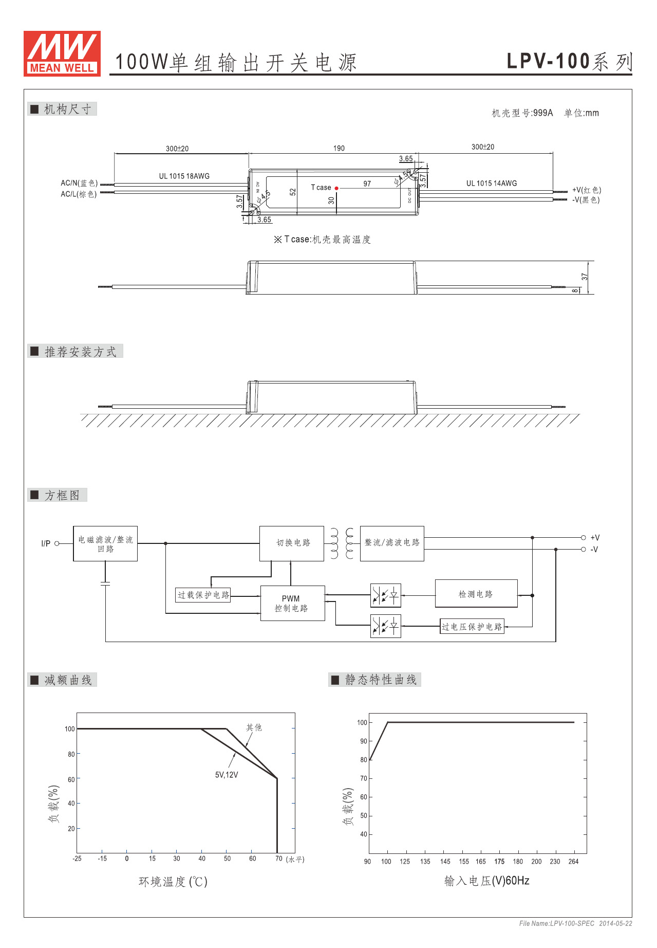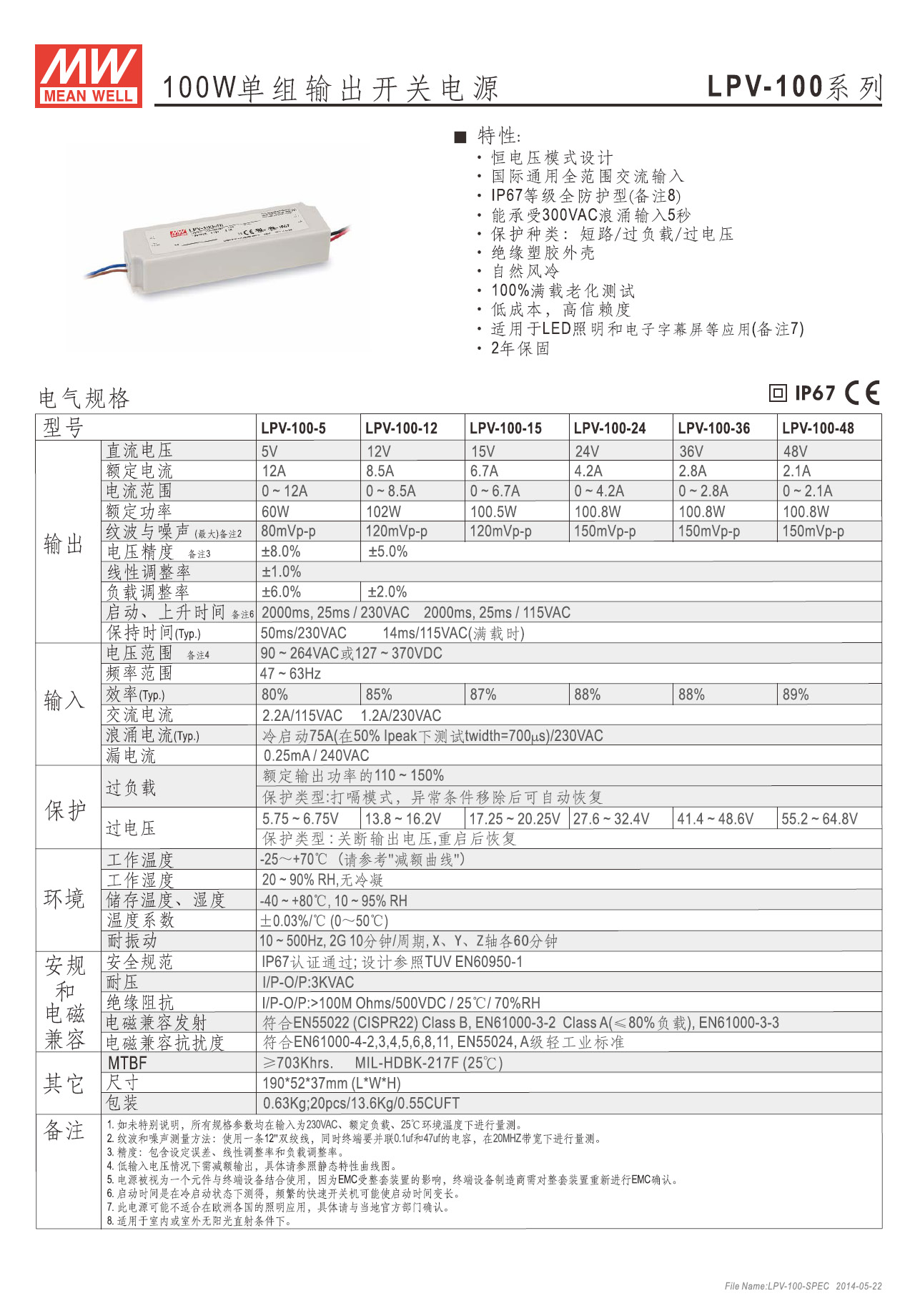 明纬 LPV-100-5 LPV-100-12  LPV-100-15  LPV-100-24 LPV-100-36  LPV-100-48 塑壳IP67防水LED恒压电源