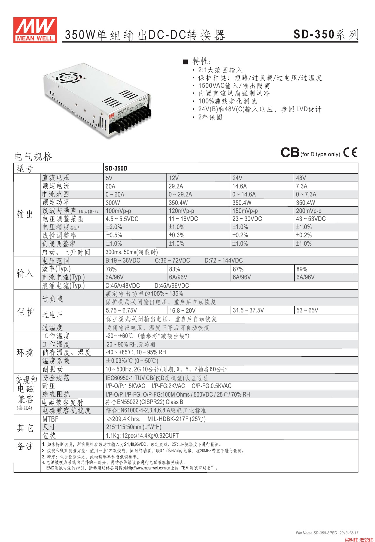 • 台湾明纬SD-500H-48 500W 72~144V 变48V DC-DC直流稳压电源