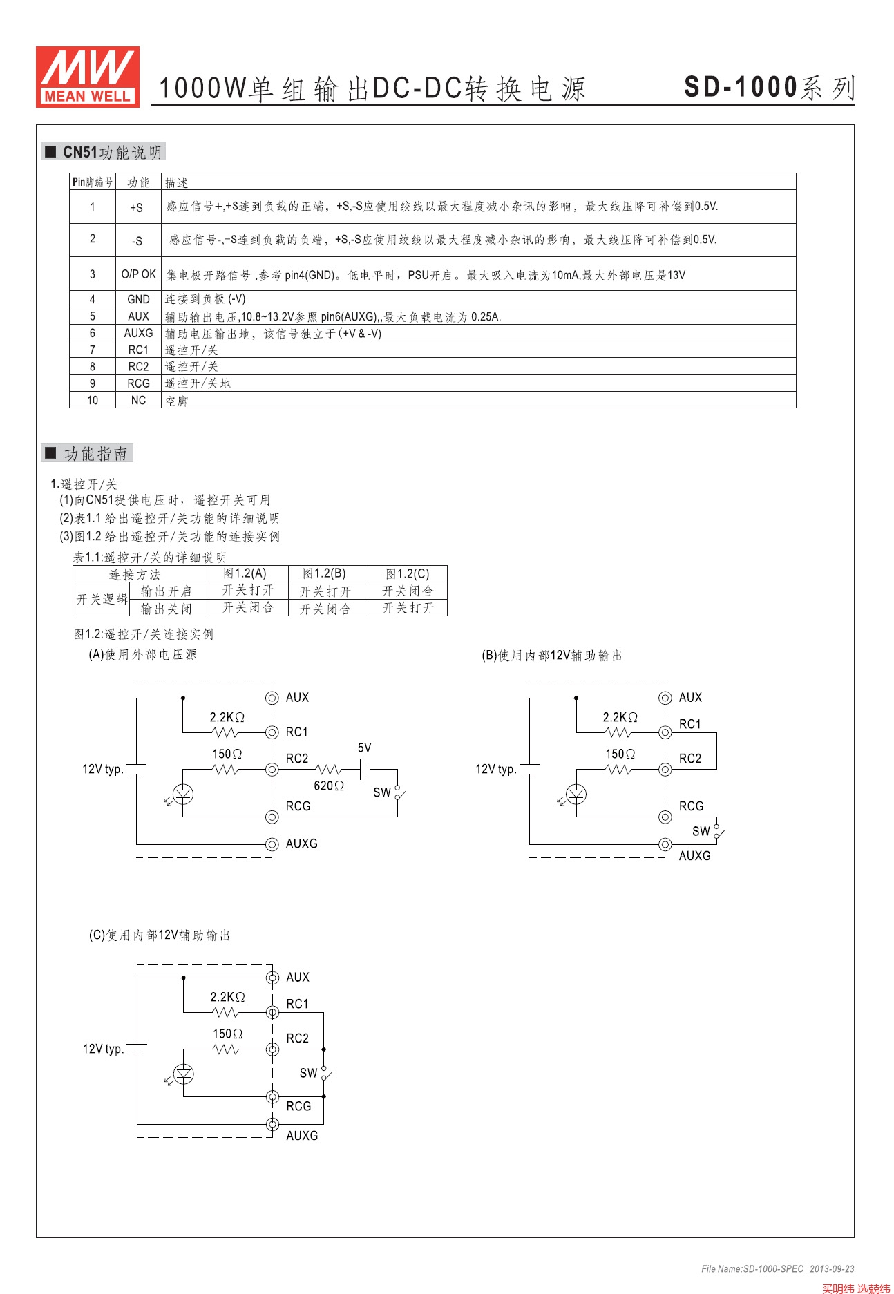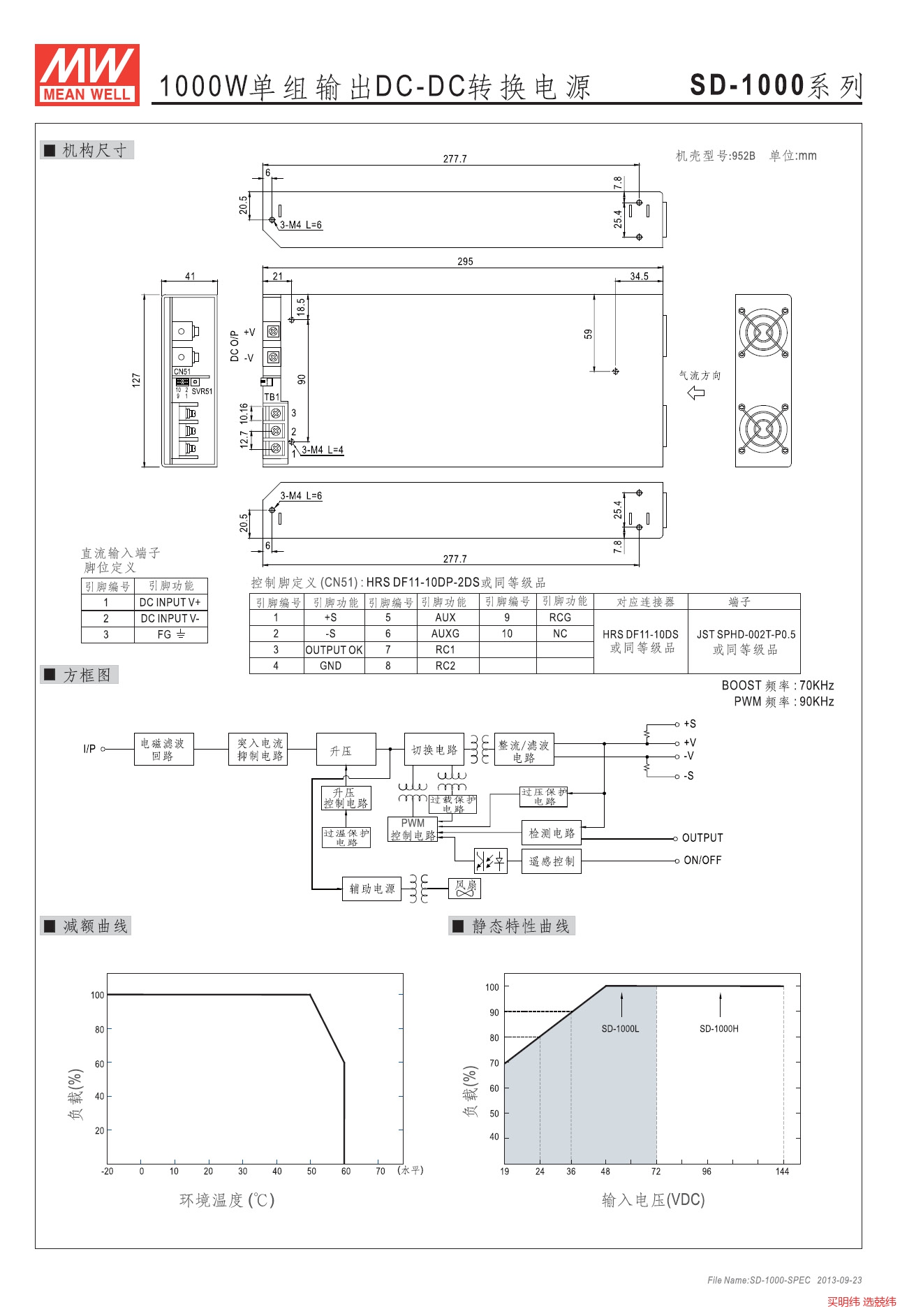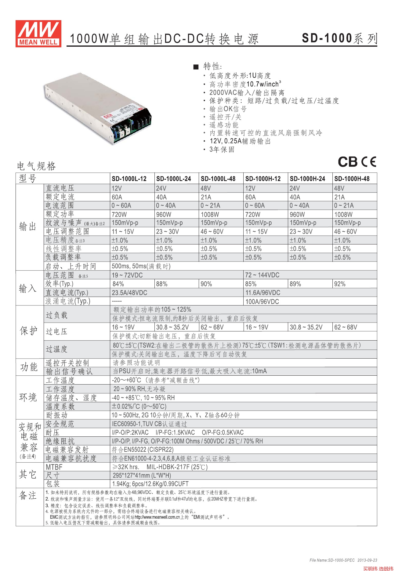 SD-1000H-48 ■ 主要特点2:1宽输入范围有短路保护/过载保护/过电压保护/过热保护通过国际安规认证UL / CE /24V和48V输入机型参照LVD设计自然通风冷却开关工作频率:100KHz输入/输出端隔离电压高达1500Vdc100%满载老化测试采用无铅制程,符合环保RoHS要求台湾明纬品牌,苏州工厂生产2年质保