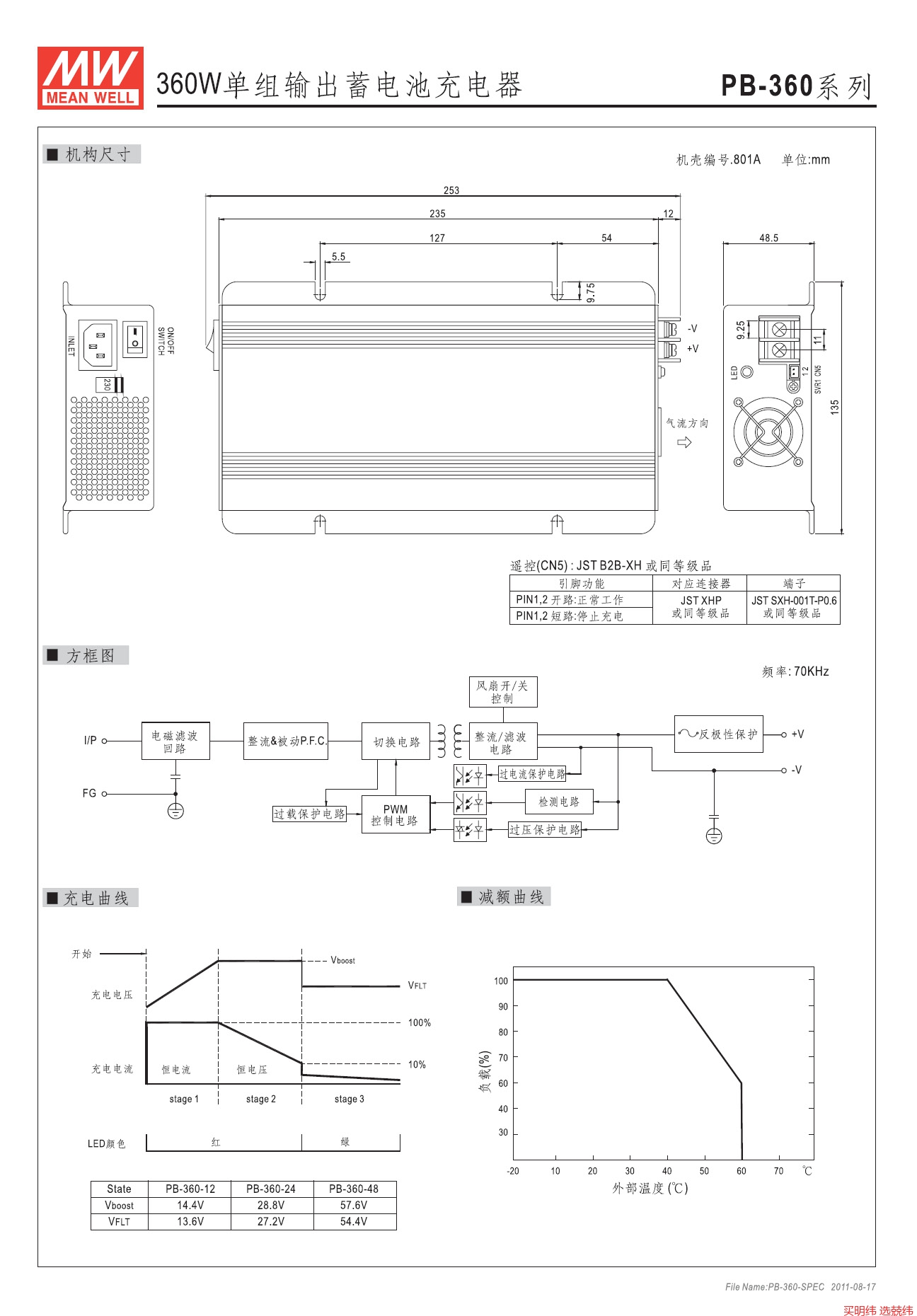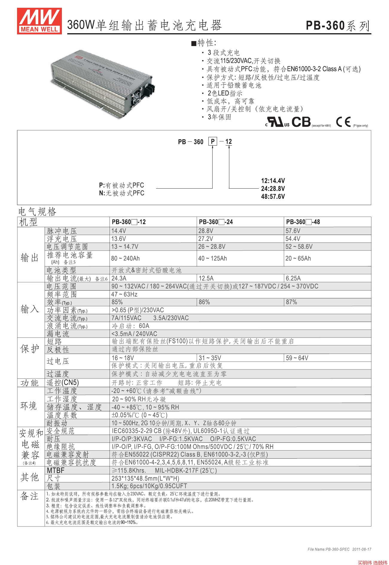• PB-360-12/24/48 360W 明纬带PFC优化三段式电瓶充电器