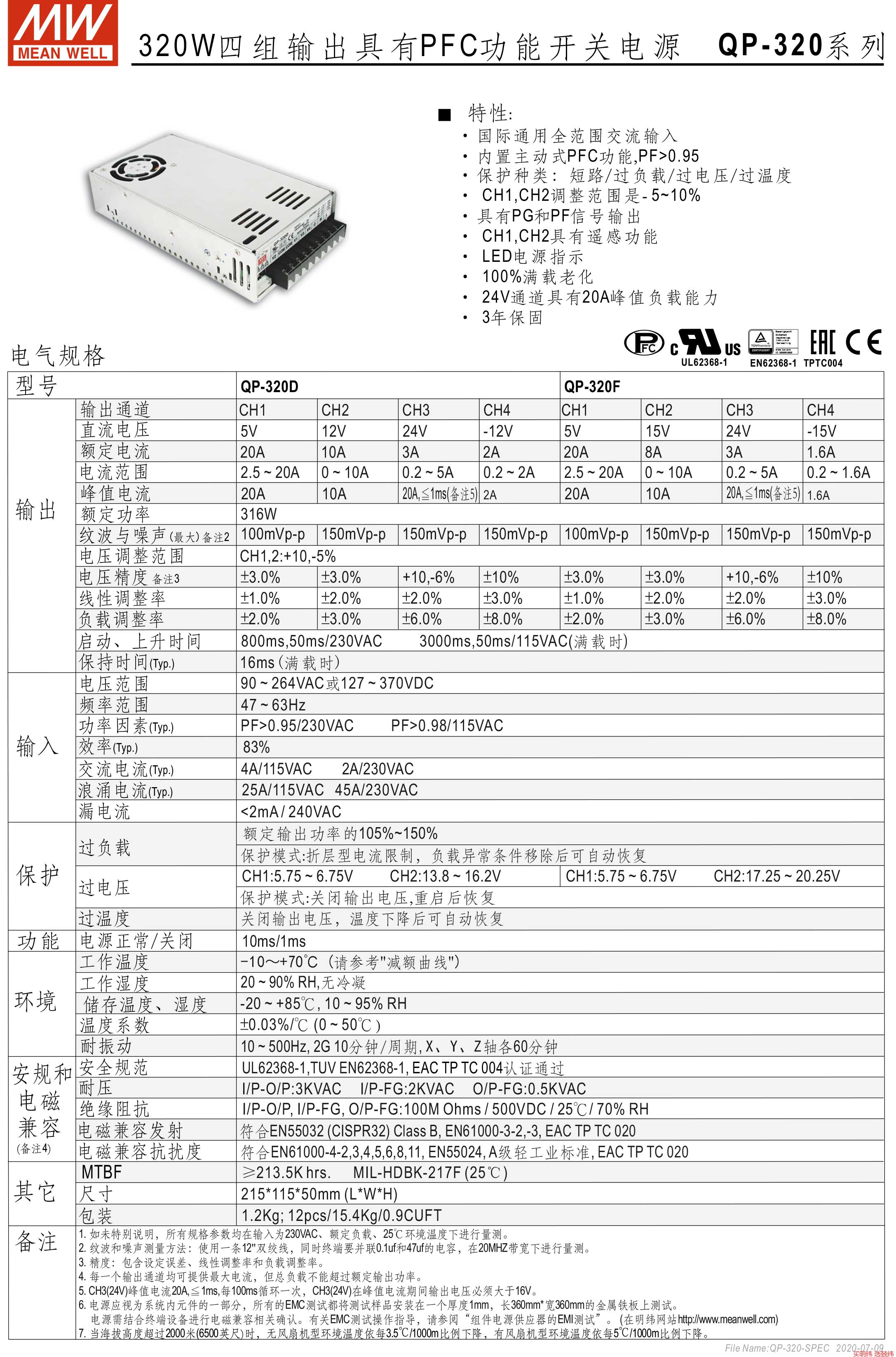QP-320D,320W四组输出具有PFC功能开关电源QP-320F,320W四组输出具有PFC功能开关电源