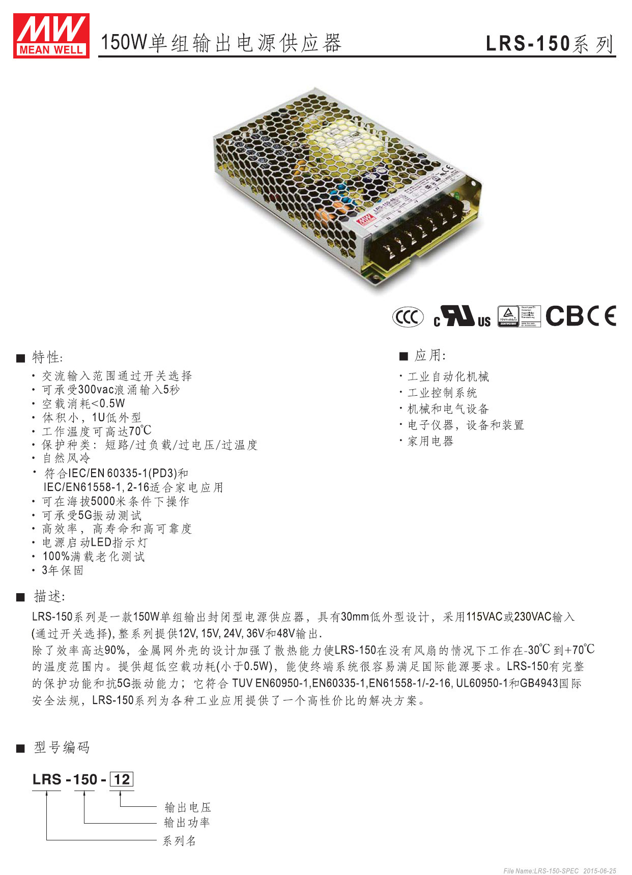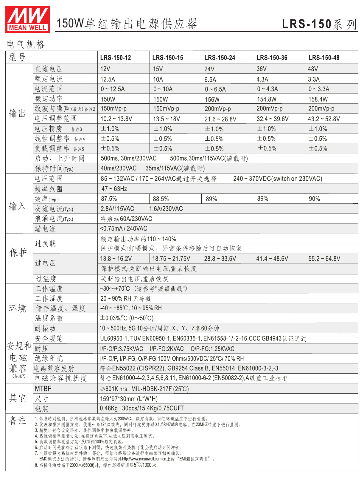 NES-150-48 150W 48V 单路输出CCC认证明纬开关电源