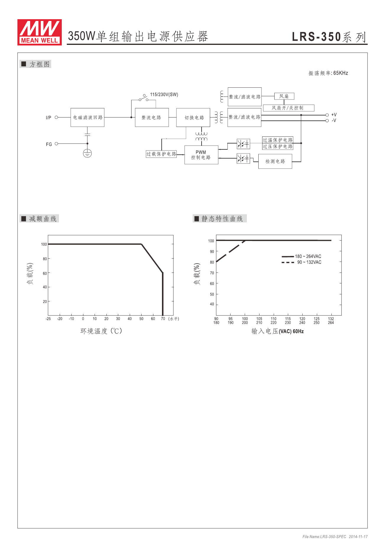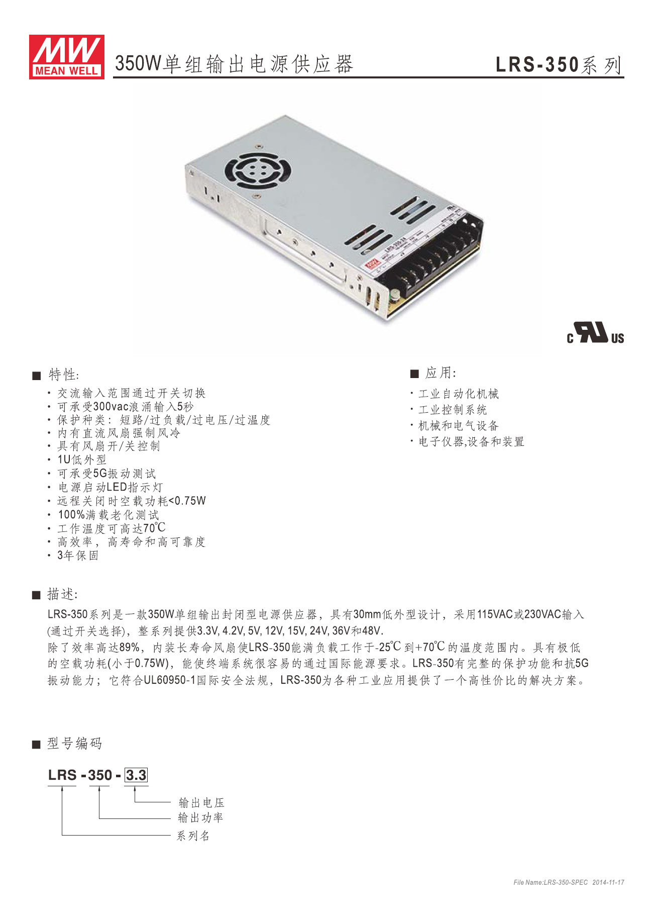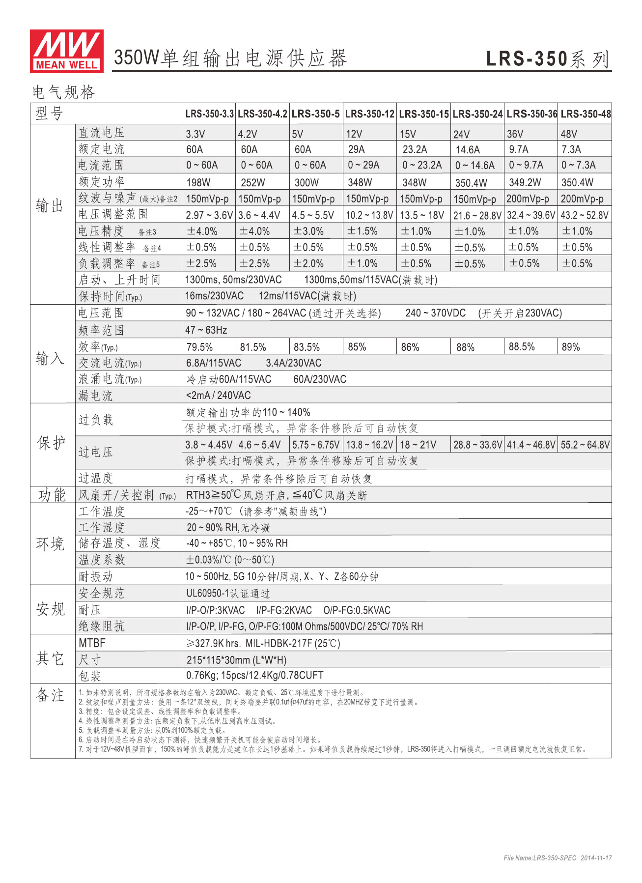 LRS-350-4.2■主要指标输入电压范围........... 90~132VAC/180~264VAC(通过开关选择) 240~370VDC(开关开启230VAC)频率范围............... 47~63Hz交流电流............... 6.8A/115VAC 3.4A/230VAC浪涌电流............... 冷启动60A/15VAC 60A/230VAC过负载保护............. 额定输出功率的110~140%,保护模式:打嗝模式,异常条件移除后可自动恢复过电压保护............. 保护模式:打嗝模式,异常条件移除后可自动恢复过温度保护............. 打嗝模式,异常条件移除后可自动恢复工作温度............... -25~+70℃(请参考“减额曲线”)工作湿度............... 20~90% RH,无冷凝储存温度、湿度......... -44~+85℃,10~95% RH温度系数............... +-0.03%/℃(0~50℃)尺寸................... 215*115*30mm(L*W*H)包装................... 0.76kg;15台/12.4kg/0.78CUFT
