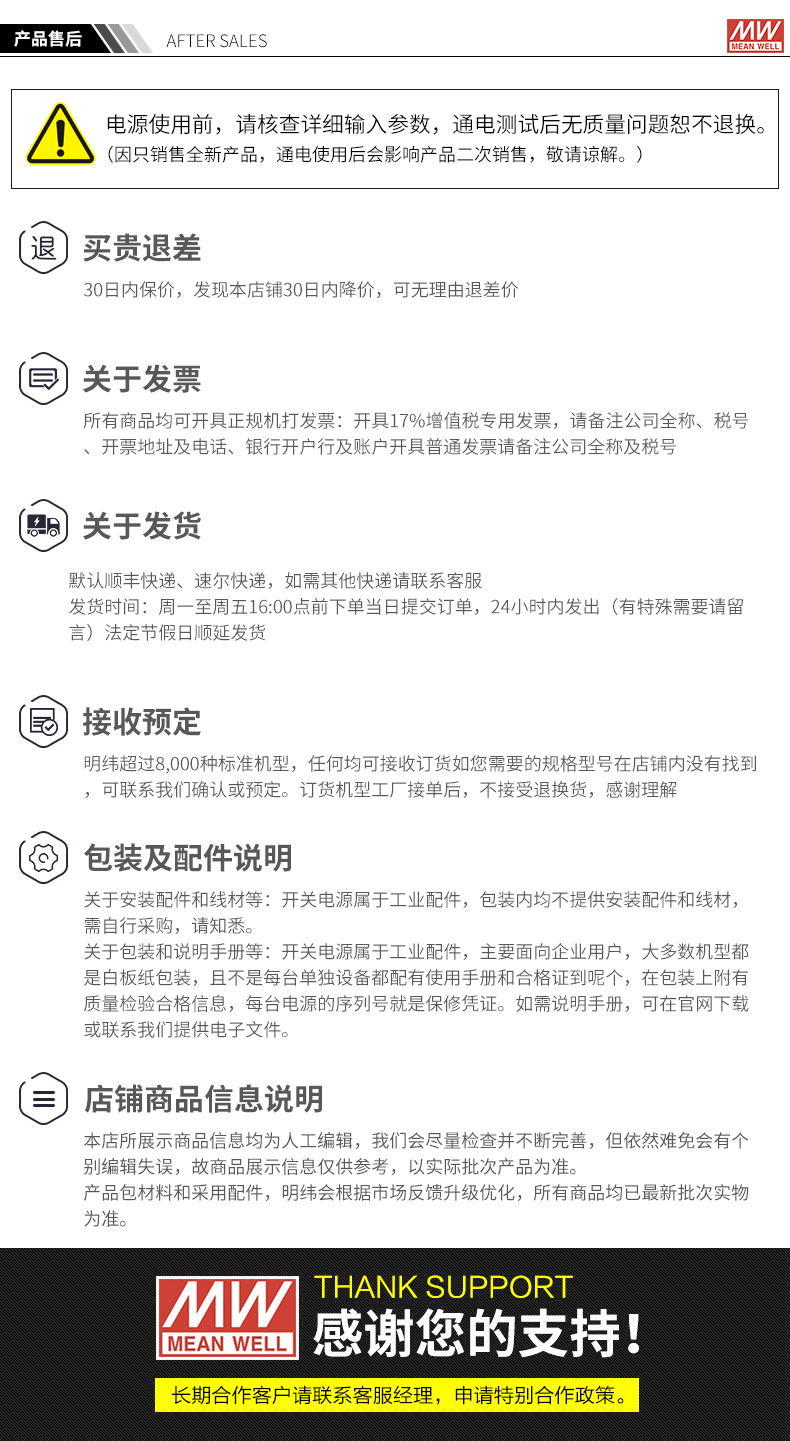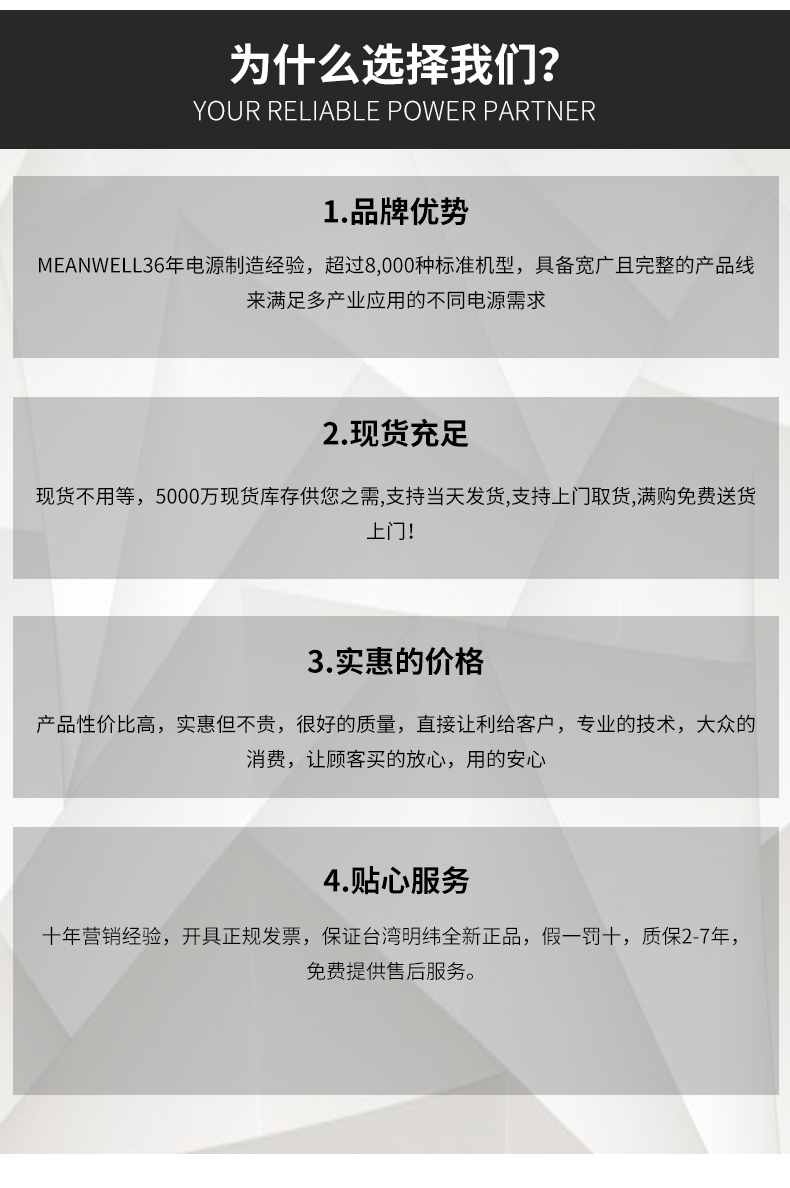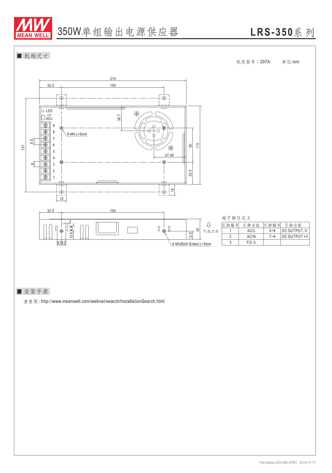 LRS-350-4.2■主要指标输入电压范围........... 90~132VAC/180~264VAC(通过开关选择) 240~370VDC(开关开启230VAC)频率范围............... 47~63Hz交流电流............... 6.8A/115VAC 3.4A/230VAC浪涌电流............... 冷启动60A/15VAC 60A/230VAC过负载保护............. 额定输出功率的110~140%,保护模式:打嗝模式,异常条件移除后可自动恢复过电压保护............. 保护模式:打嗝模式,异常条件移除后可自动恢复过温度保护............. 打嗝模式,异常条件移除后可自动恢复工作温度............... -25~+70℃(请参考“减额曲线”)工作湿度............... 20~90% RH,无冷凝储存温度、湿度......... -44~+85℃,10~95% RH温度系数............... +-0.03%/℃(0~50℃)尺寸................... 215*115*30mm(L*W*H)包装................... 0.76kg;15台/12.4kg/0.78CUFT