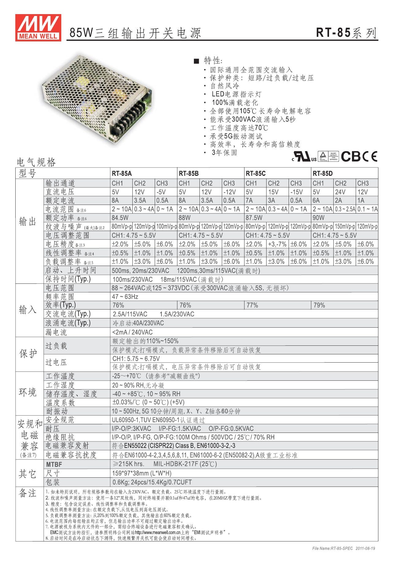 电磁兼容标准 发射:EN55022(CISPR22) class B 谐波:EN61000-3-2,-3