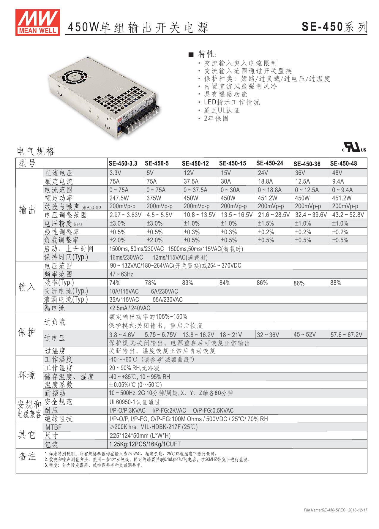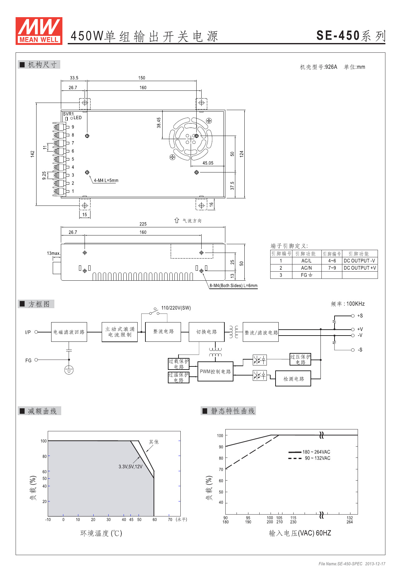 SE-450-48■ 主要参数直流输出范围 48V,0~9.4A输出电压精度 ±1%纹波 200mV效率 88%输入电压范围 由开关选择90~132VAC/180~264VAC/或 254~370VDC输入浪涌电流 冷启动230V时为55A电压调整范围 额定输出电压的±10%过载保护 过电流点在105%~135%,恒流限流,自动恢复过电压保护 额定输出电压的115%~145% ,自动恢复过热保护 80℃±5℃(3.3~12V)/90℃±5℃(15~48V)(TSW1检测晶体管散热器)关断电压,降温后自动恢复启动,上升时间 230VAC满载时1000ms,50ms绝缘特性 输入端与输出端间: 3KVac,输入端与外壳间: 1.5KVac,输出端与外壳间: 0.5KVac,1分钟工作温度 -10~+60℃(参考温度降载曲线)抗震动性 10~500Hz,2G 10分钟/周期,XYZ各轴各60分钟安规认证 通过UL60950-1平均无故障时间 ≥20万小时,MIL-HDBK-217F(25℃)接线方式 9P/11mm带盖端子排外形尺寸 225×124×50mm (长×宽×高)机壳号 986重量及包装 1.25公斤,每箱12台/16公斤,0.0275立方米