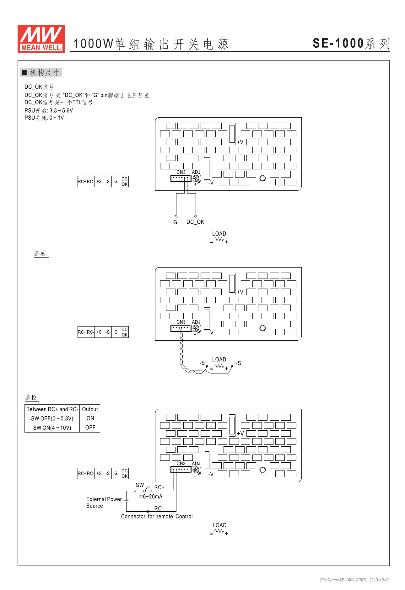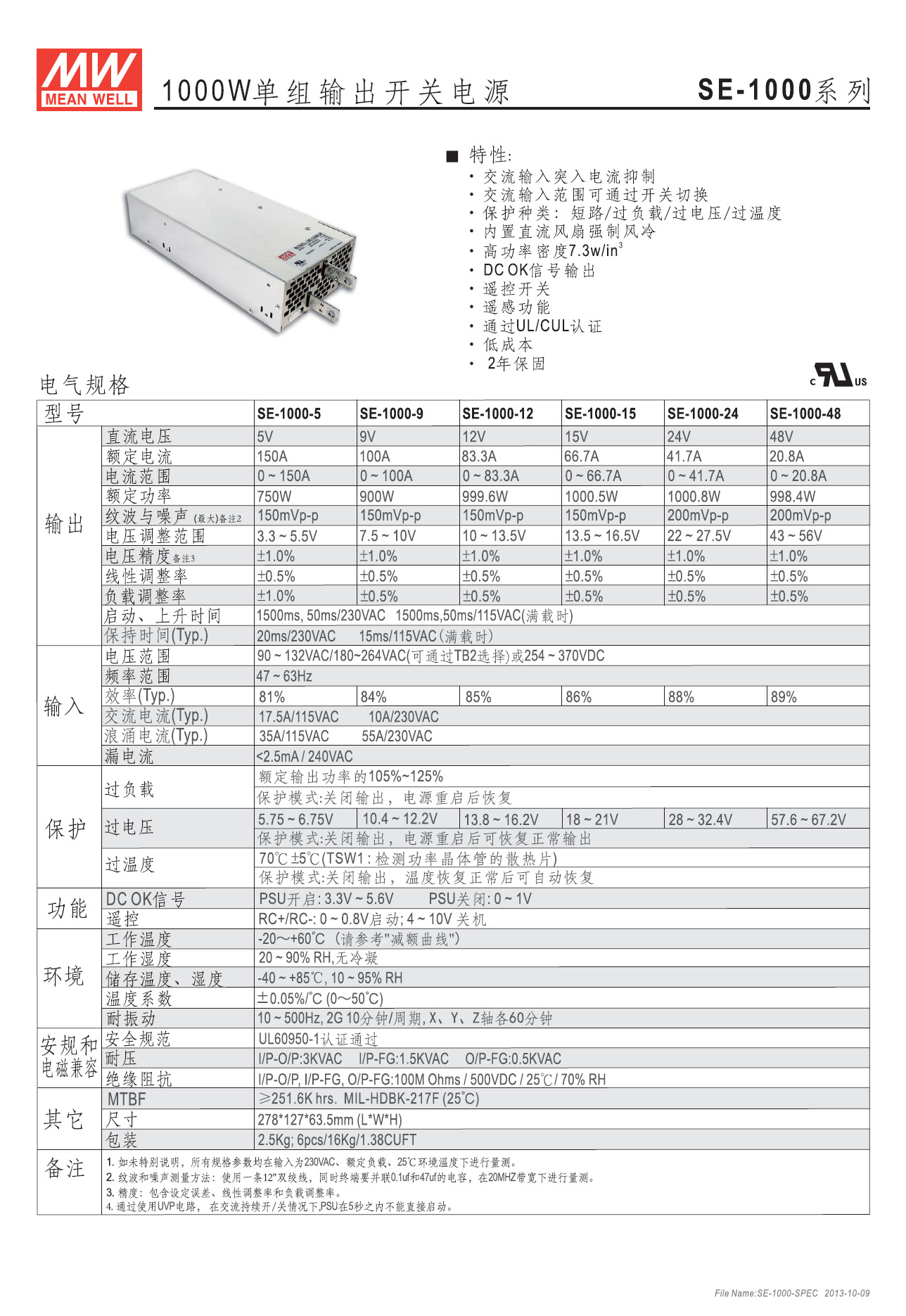 SE-1000-12■ 主要参数直流输出范围 12V,0~83.3A输出电压精度 ±1%纹波 150mV效率 85%输入电压范围 由短路片选择90~132VAC/180~264VAC/或 254~370VDC输入浪涌电流 冷启动230V时为55A电压调整范围 额定输出电压的±10%过载保护 过电流点在105%~125%,时断电,重启后复原过电压保护 额定输出电压的115%~140% ,自动恢复过热保护 70℃±5℃(TSW1检测晶体管散热器)关断电压,降温后自动恢复启动,上升时间 230VAC满载时1500ms,50ms绝缘特性 输入端与输出端间: 3KVac,输入端与外壳间: 1.5KVac,输出端与外壳间: 0.5KVac,1分钟工作温度 -20~+60℃(参考温度降载曲线)抗震动性 10~500Hz,2G 10分钟/周期,XYZ各轴各60分钟安规认证 通过UL60950-1平均无故障时间 ≥25.16万小时,MIL-HDBK-217F(25℃)接线方式 输入为3P/10mm带盖端子排;输出为铜导流排外形尺寸 278×127×63.5mm (长×宽×高)机壳号 935B重量及包装 2.5公斤/只;每箱6只/16公斤/0.039立方米