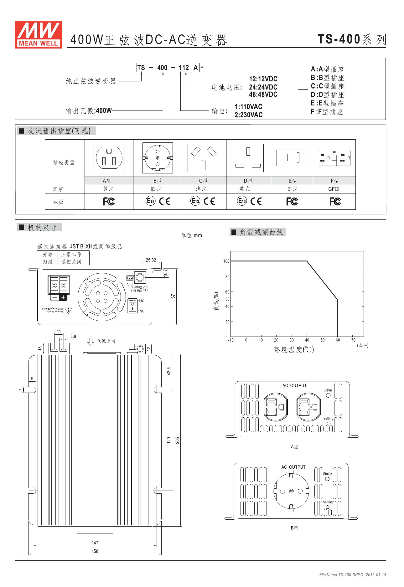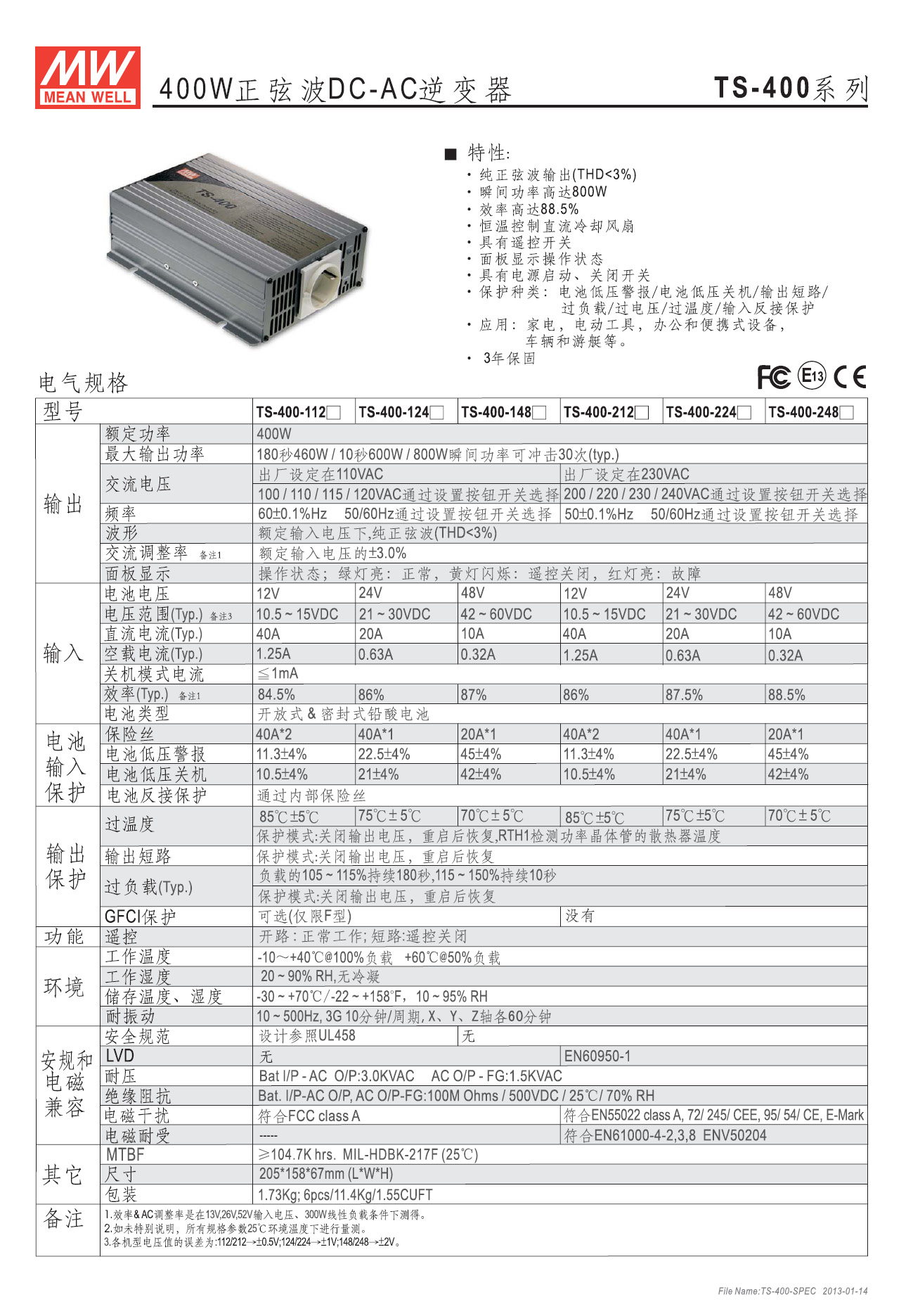 • TS-400系列 明纬 正弦波车载逆变器原装进口,符合全球认证要求